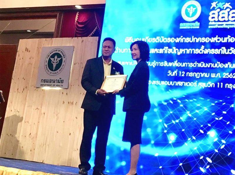เทศบาลตำบลหนองหญ้าดอกขาว เข้าพิธีรับเกีรติบัตรจาก สสส.ประจำปี 2562
